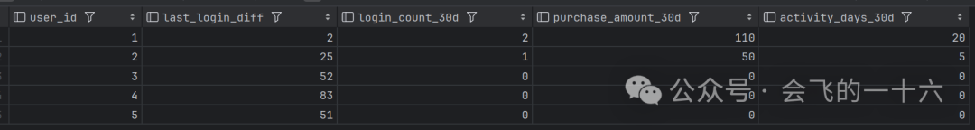 WITH user_behavior_features AS (SELECTuser_id,-- 计算最近一次登录距今天数datediff(current_date, MAX(login_time)) AS last_login_diff,-- 计算近30天登录次数COUNT(DISTINCT CASE WHEN datediff(current_date, login_time) <= 30 THEN login_time END) AS login_count_30d,-- 计算近30天消费总金额SUM(CASE WHEN datediff(current_date, login_time) <= 30 THEN purchase_amount ELSE 0 END) AS purchase_amount_30d,-- 计算近30天活跃天数SUM(CASE WHEN datediff(current_date, login_time) <= 30 THEN activity_days ELSE 0 END) AS activity_days_30dFROMuser_behaviorGROUP BYuser_id)SELECTuser_id,last_login_diff,login_count_30d,purchase_amount_30d,activity_days_30dFROMuser_behavior_features;