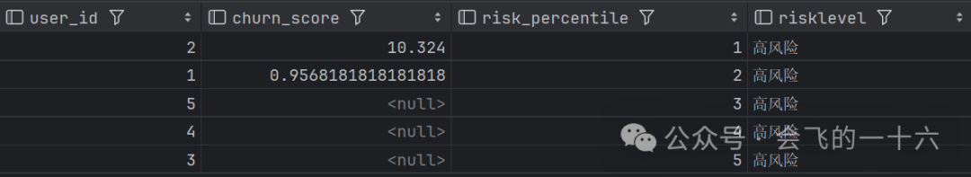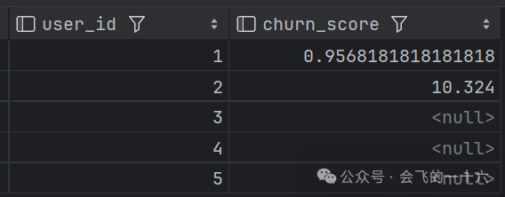 计算加权评分,由于是风险模型,因此对于登录次数,消费金额以及活跃天数需要进行倒数处理,值越大风险越高WITH user_behavior_features AS (SELECTuser_id,-- 计算最近一次登录距今天数datediff(current_date, MAX(login_time)) AS last_login_diff,-- 计算近30天登录次数COUNT(DISTINCT CASE WHEN datediff(current_date, login_time) <= 30 THEN login_time END) AS login_count_30d,-- 计算近30天消费总金额SUM(CASE WHEN datediff(current_date, login_time) <= 30 THEN purchase_amount ELSE 0 END) AS purchase_amount_30d,-- 计算近30天活跃天数SUM(CASE WHEN datediff(current_date, login_time) <= 30 THEN activity_days ELSE 0 END) AS activity_days_30dFROMuser_behaviorGROUP BYuser_id),user_churn_score AS (SELECTuser_id,-- 计算加权评分,由于是风险模型,因此对于登录次数,消费金额以及活跃天数需要进行倒数处理,值越大风险越高(0.4 * last_login_diff) +(0.3 * (1.0 / NULLIF(login_count_30d, 0))) +(0.2 * (1.0 / NULLIF(purchase_amount_30d, 0))) +(0.1 * (1.0 / NULLIF(activity_days_30d, 0))) AS churn_scoreFROMuser_behavior_features)SELECTuser_id,churn_scoreFROMuserchurnscore;