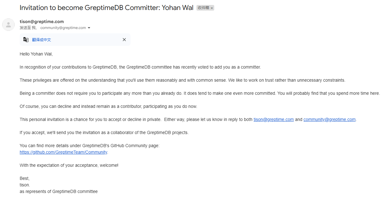 “社区的开发者关系负责人发了封邮件,跟我解释了为什么让我成为 Committer,当时有点不敢相信。”