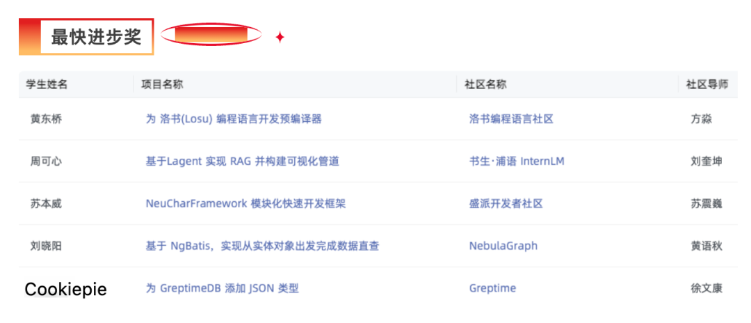 @Cookiepie 和 @Weny 导师在尝试开源项目的时候,基本都是按照这样一个相同的思路进行的。JSON 类型在 GreptimeDB 的实现这个项目其实有很多优秀的候选人,但或许就是两个人相似的思考逻辑和同样高效的动手能力,才让他们一起完成了这个项目合作。开源社区的互帮互助是一个始终遵循的惯例,对于想要迫切上手项目的同学来说,是一个非常完美的选择。通过在 GreptimeDB 社区的长期耕耘,最终项目成功结项。同时,@Cookiepie 同学还被 OSPP 官方认证了“最佳进步奖”。