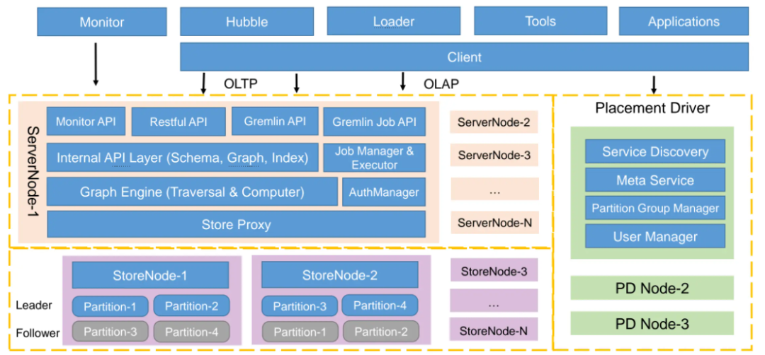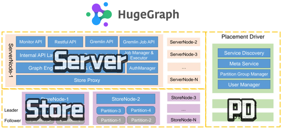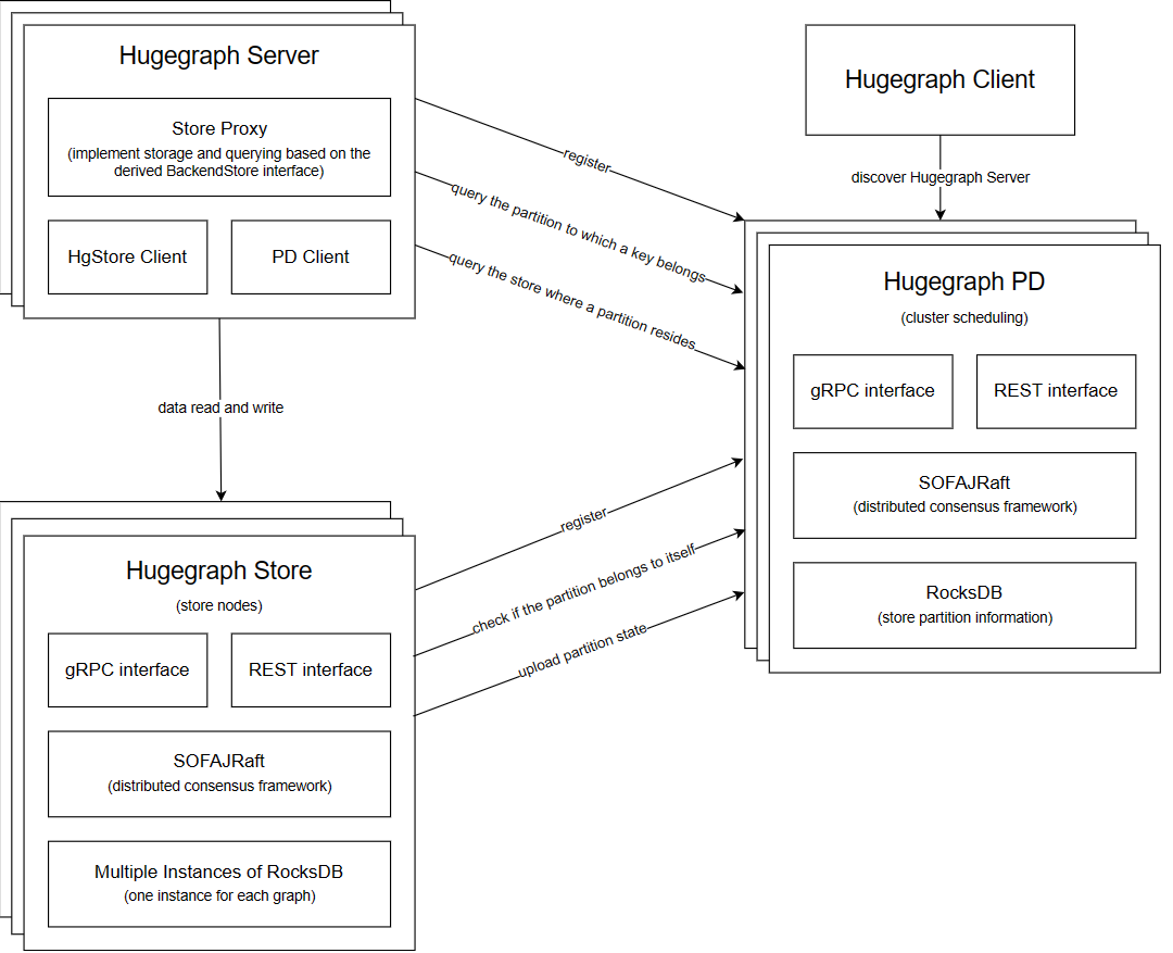 在分布式版本下,Graph 被切分成多个 Partition,以实现水平扩展;每个 Partition 通过多个副本(Shard)来确保高可用,这些副本分别保存在不同的 Store 节点上,并使用 Raft 进行一致性管理;与此同时,Store 节点承担存储和部分计算的职责,每个图对应一个单独的 RocksDB 实例,用于存储点、边和索引数据;PD 作为元数据中心,负责追踪所有 Partition 和 Shard 的分配与迁移,并根据负载状况或故障情况执行自动调度,从而实现更优的资源利用率与高可用性。完整的 HugeGraph 分布式架构如下图所示: