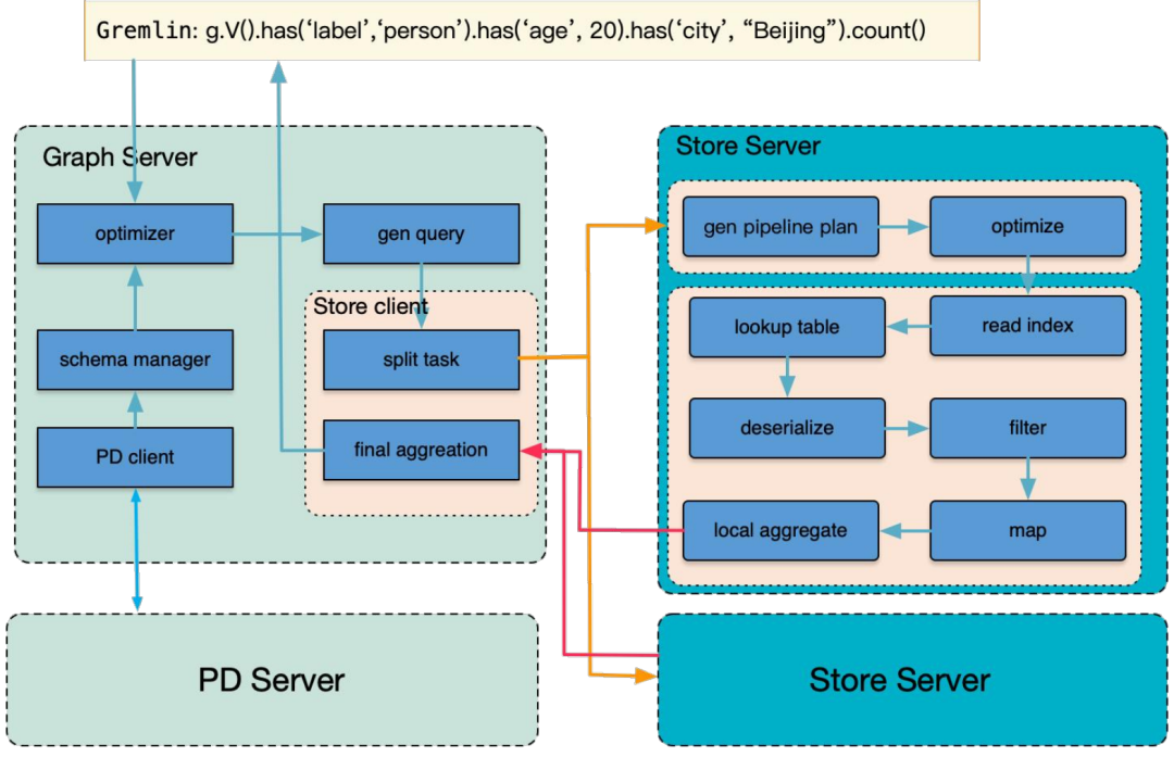 此外,HugeGraph 在分布式场景中为了提升查询效率与可扩展性,引入了计算下推这一机制:在 Store 节点上直接执行部分计算 (如 Aggregate/LimitAndOffset 等) 后,再将精简后的结果返回给 Server,使得 Server 无需处理过多的原始数据加载与过滤;这样的架构不仅充分利用了 Store 节点的存储与处理能力,还能够减少网络传输开销,从而在大规模图数据场景下实现更高效的计算与查询。
