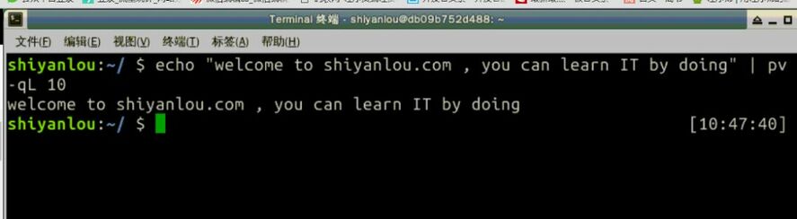 $ echo "welcome to shiyanlou.com , you can learn IT by doing" | pv -qL 10