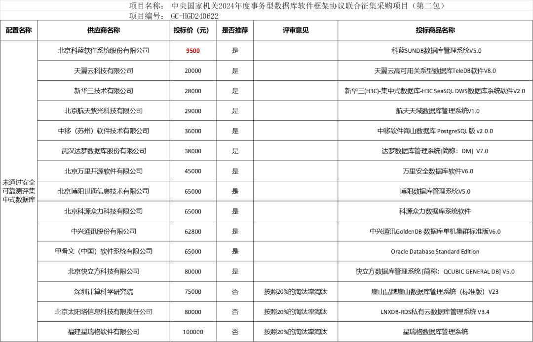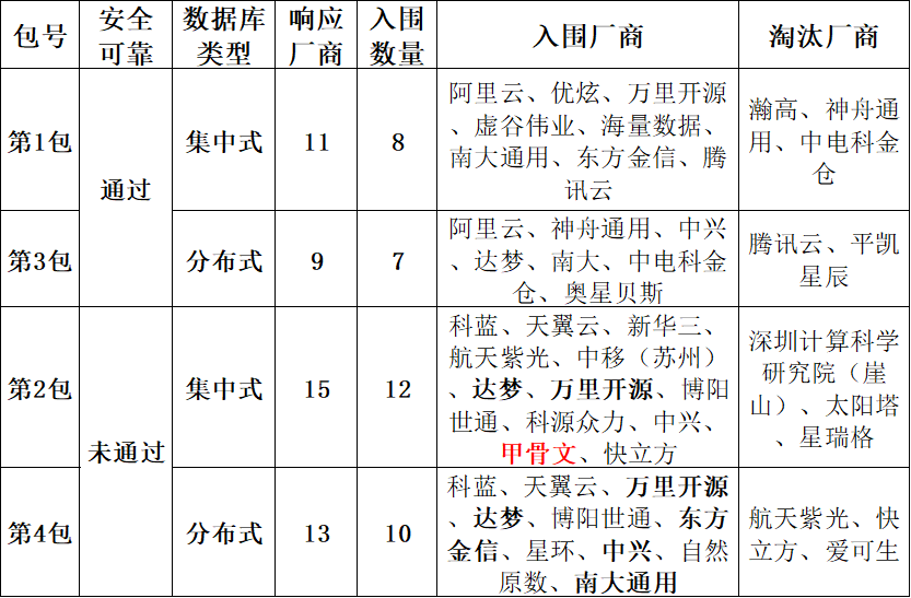 整个招标产品分为4类,包括通过安全可靠测评的集中式、分布式,以及未通过安全可靠测评的集中式、分布式。 从招标结果看,价格从低到高排序是入围的关键关键因素。 老四家只有南大通用入围包1(安全可靠集中式),金仓、神舟因为高价遗憾落榜,而达梦就直接没参与次包; 然而老四家(金仓、达梦、南大、神舟)都入围了包3(安全可靠分布式),而腾讯和TIDB遗憾落选此包; 安全可靠数据库厂商达梦、万里、中兴、南大、东方金信,在包2/4(未通过安全可靠测评的数据库)中也都有入围,因为他们在此投了未通过测评的数据库版本; 甲骨文(Oracle)数据库竟然入围了第2包(未通过安全可靠测评的集中式数据库),然而招标要求中明确产品的产地为“中国”(有人疑惑,难道Oracle是中国产的么~); 其中包1/3(安全可靠集中式/分布式)最低报价都是阿里云(3.7万),包2/4(未通过安全可靠集中式/分布式)最低报价都是科蓝软件(仅有9500元)!其次是天翼云(2万)。 另外,有一些数据库领域的生面孔出现在包2/4,例如博阳世通、自然原数、科源众力。