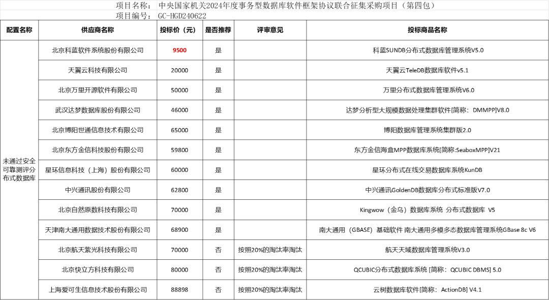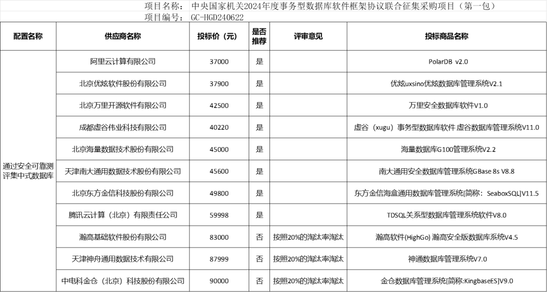 入围厂商8家(报价-万):阿里云(3.7)、优炫(3.8)、万里开源(4.3)、虚谷伟业(4)、海量数据(4.5)、南大通用(4.6)、东方金信(5)、腾讯云(6)。 落选厂商3家:瀚高(8.3)、神舟(8.8)、金仓(9)