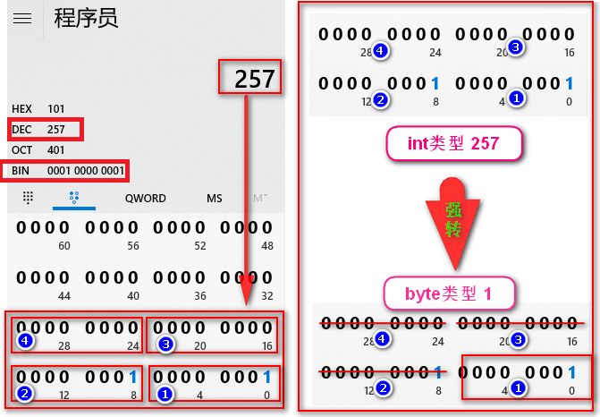 byte a = (byte)257;System.out.println(a); //运行发现结果为1