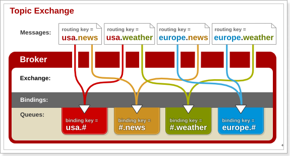 `audit.#`:能够匹配`audit.irs.corporate` 或者 `audit.irs``audit.*`:只能匹配`audit.irs`模型图: