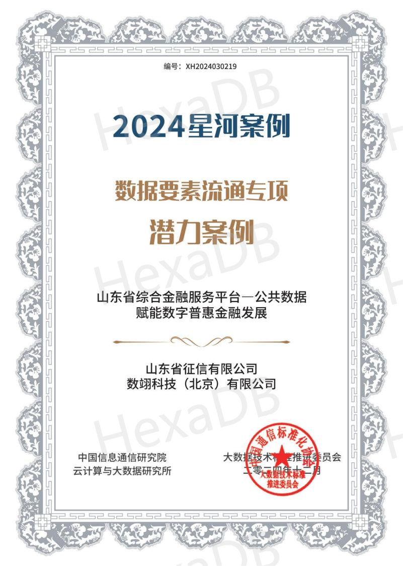 近日,由中国通信标准化协会主办的2024数据资产管理大会在北京盛大召开。大会聚焦数据资产化、数据治理、数据安全、数据流通、数智底座等行业热点话题,共同探讨如何驱动产业升级和社会发展,并重磅发布了2024年大数据“星河”案例。HexaDB联合客户一同申报的“山东省综合金融服务平台—公共数据赋能数字普惠金融发展”项目,成功入选2024大数据“星河”案列数据要素流通专项-潜力案例。