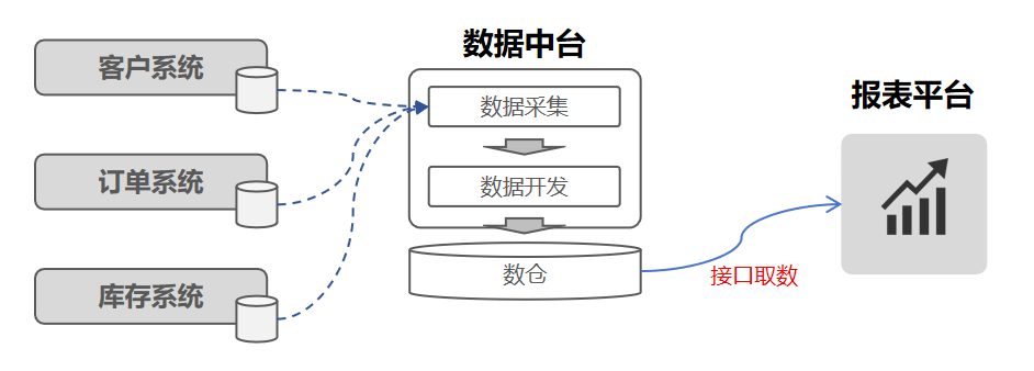 1)产品架构:分别部署一套数据中台、一套报表开发平台,数据治理完成后,报表平台再通过接口从中台取数;
