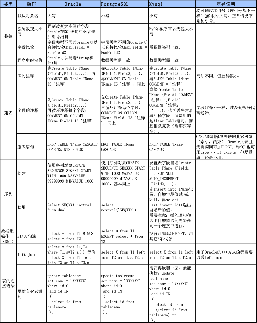 主流分布式数据库主要选型PG(openGauss)和MySQL(OB、GoldenDB),因此需要对Oracle、PG、MySQL之间的语法兼容性做一下差异分析(分布式厂家会对兼容性差异做适配,减少差异,该部分不在讨论范围),然后研发按图索骥对不兼容项进行改造,以下为三者之间的主要区别: