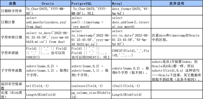 与语法兼容性类似,除厂家进行兼容性改造外,Oracle、PG、MySQL之间也需要对函数差异进行改造,常见的函数差异如下: