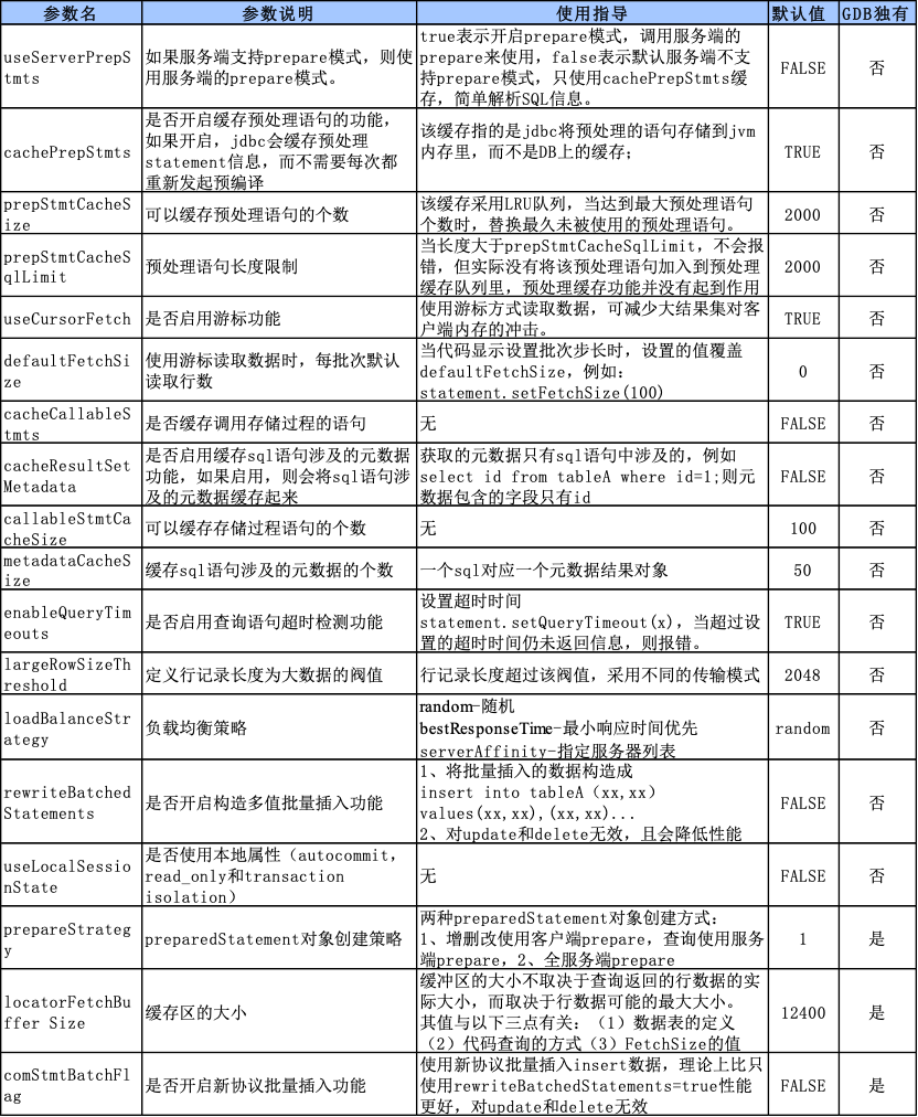 JAVA应用通常使用JDBC协议连接数据库,除替换驱动程序外,还需要对分布式数据库的驱动连接和高可用特性参数进行设置,以更好地利用分布式数据库优势,以下是GoldenDB改造过程中的常用驱动协议属性改造点。