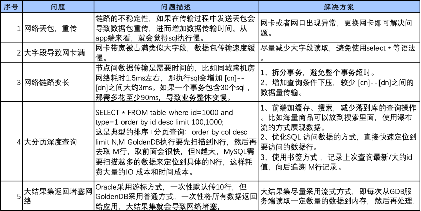 应用与Proxy间的网络传输也是重要问题,可能导致问题包括网络本身问题、数据获取机制、数据结果集过大等,以下是我们在GoldenDB改造踩过的一些坑及解决方案:
