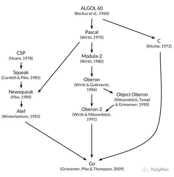 Go的很多语言特性借鉴与它的三个祖先:C,Pascal和CSP。Go的语法、数据类型、控制流等继承于C,Go的包、面对对象等思想来源于Pascal分支,而Go最大的语言特色,基于管道通信的协程并发模型,则借鉴于CSP分支。