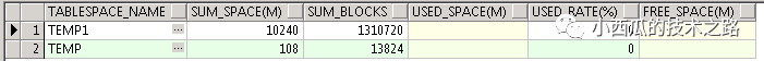 SELECT D.tablespace_name, SPACE "SUM_SPACE(M)", blocks "SUM_BLOCKS", used_space "USED_SPACE(M)", Round(Nvl(used_space, 0) / SPACE * 100, 2) "USED_RATE(%)", SPACE - used_space "FREE_SPACE(M)" FROM (SELECT tablespace_name, Round(SUM(bytes) / (1024 * 1024), 2) SPACE, SUM(blocks) BLOCKS FROM dba_temp_files GROUP BY tablespace_name) D, (SELECT tablespace, Round(SUM(blocks * 8192) / (1024 * 1024), 2) USED_SPACE FROM v$sort_usage GROUP BY tablespace) F WHERE D.tablespace_name = F.tablespace(+) AND D.tablespace_name in ('TEMP', 'TEMP1')