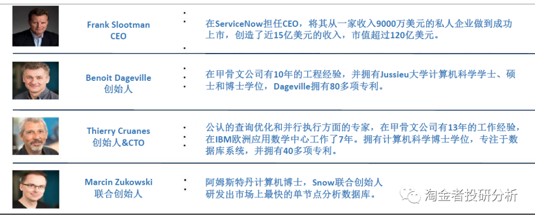 Snowflake由三位数据仓库专家Benoit Dageville,Thierry Cruanes和Marcin Zukowski共同创立。