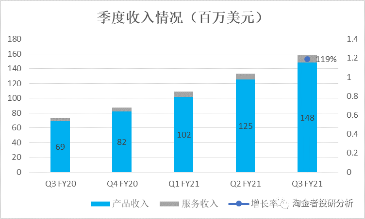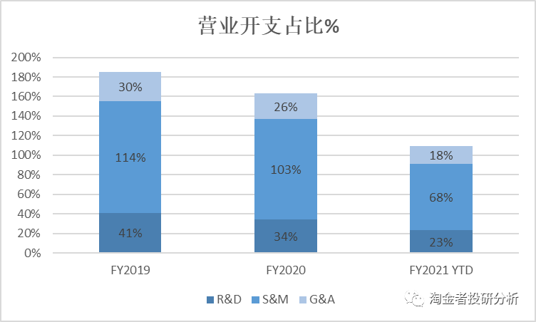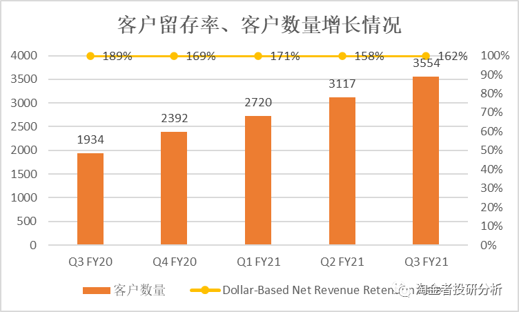 Q3的客户总数量达到3554,同比增长84%,产品收入超过100万美元的客户达到65家,同比增长110%。大客户贡献收入比重持续增长,2021财年上半年为56%。