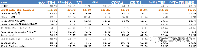 从Non-Gaap毛利率水平来看,Snow的Q3毛利率68%,接近Saas可比公司平均水平70%,而数据库管理系统公司MongoDB毛利率70%。自助服务数据分析软件领先供应商Alteryx,毛利率90%。因此公司毛利率仍有较大的提升空间,净利润亏损维持逐步缩窄的趋势。