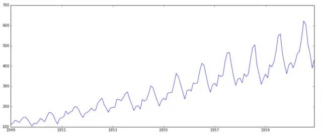 为了进一步观测乘客人数的变化情况,可以对数据进行可视化,用折线图把乘客人数画出来,从下图看到随着时间的推移,乘客人数呈上升趋势,可以推断该国的航空事业正处于上升期,同时出现每隔一段时间上升隔一段时间下降的周期性特征,每个周期变动之间又蕴含一些细微的抖动。