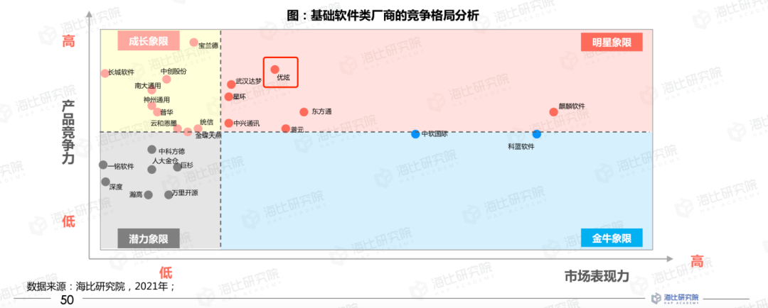 中国软件网、中国软件行业协会和海比研究院联合发布了《2021年中国信创生态研究报告》(以下简称《报告》),针对信创产业,从产业状况、生态分布、需求供给侧等方面进行了全面分析。在基础软件厂商竞争格局中,优炫软件跃居明星象限,足以证明其在数据库市场表现和产品综合竞争力表现突出,技术实力强劲,获得市场高度认可。