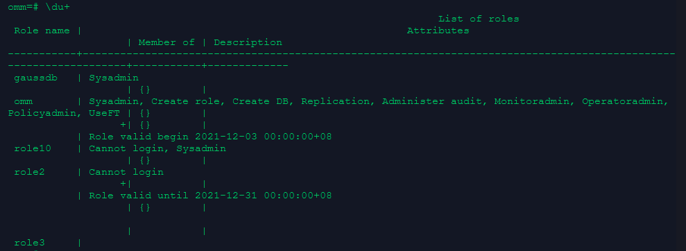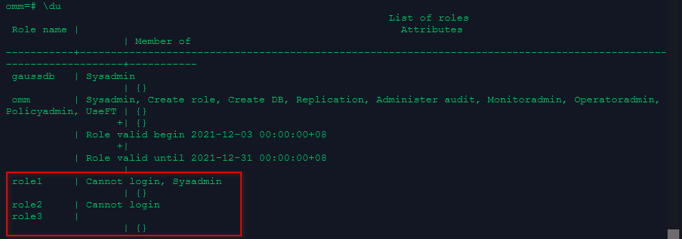 CREATE ROLE manager3 VALID BEGIN '2021-12-10' VALID UNTIL '2021-12-30' IDENTIFIED BY 'test_789' ;–再次查看所有数据库角色