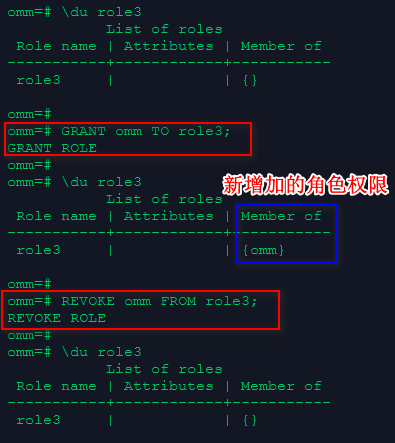GRANT omm to manager1 WITH ADMIN OPTION;4.回收权限