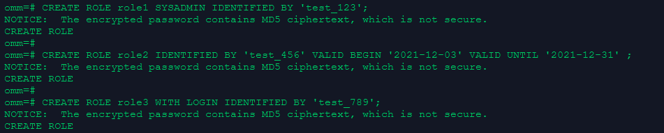 CREATE ROLE manager2 LOGIN SYSADMIN IDENTIFIED BY 'test_456';–创建角色manager3,密码test_789,从2021年12月10日生效,2021年12月30日失效