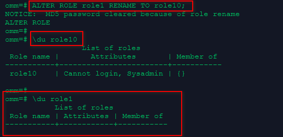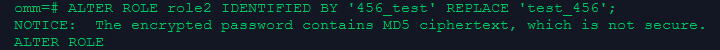ALTER ROLE manager2 IDENTIFIED BY 'abcd@123' REPLACE 'test_456';–重命名manager2