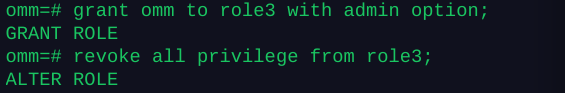 grant omm to role3 with admin option;revoke all privilege from role3;