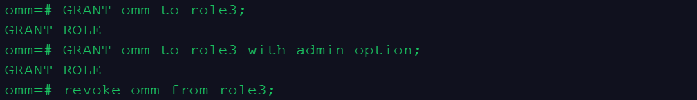 omm=# GRANT omm to role3 with admin option; ------授予omm 权限给role3,同时赋予了role3 也可以把此权限授予其他角色或用户,详细解释见 WITH ADMIN OPTION 解释