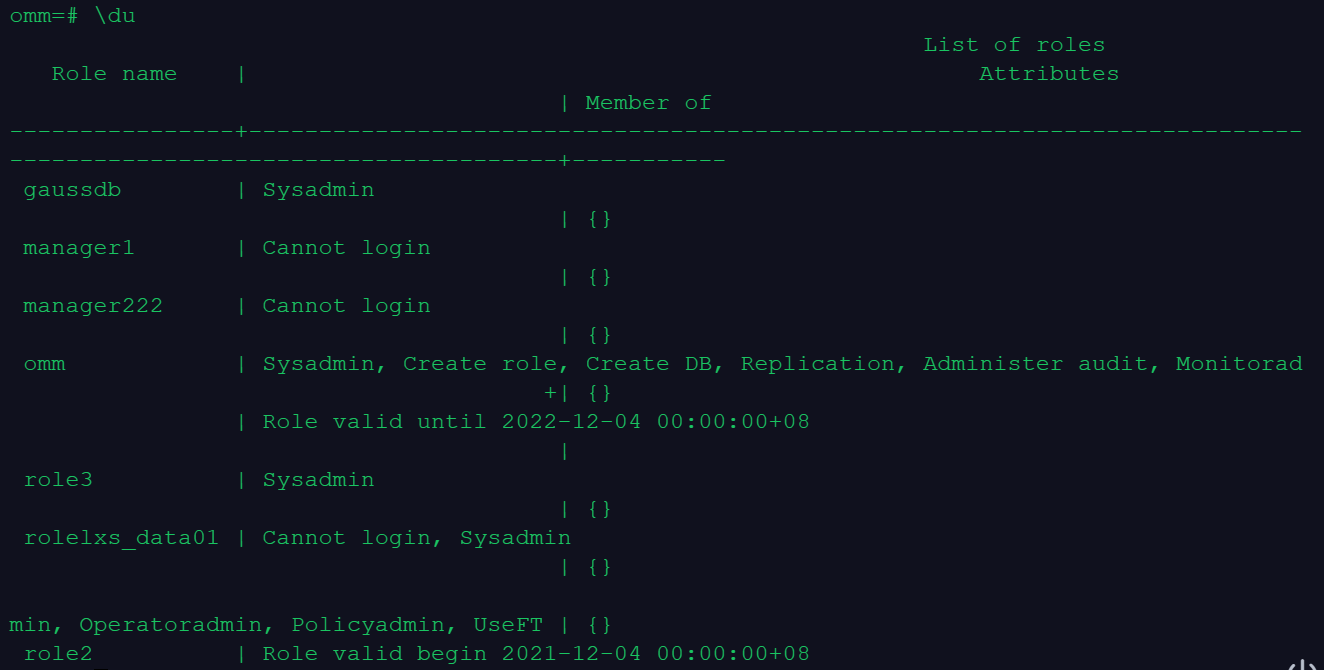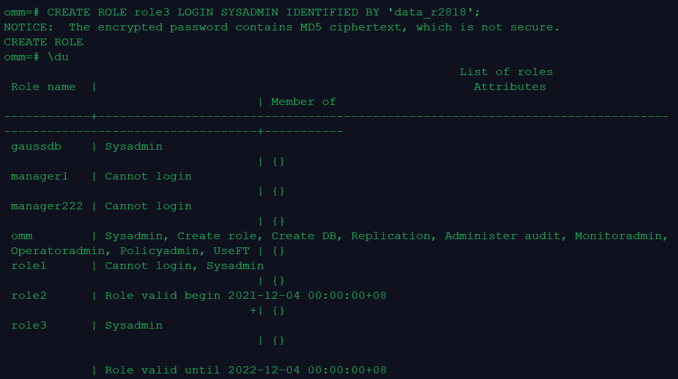 omm=# CREATE ROLE role2 WITH LOGIN PASSWORD 'lxs_data_123' VALID BEGIN '2021-12-04' VALID UNTIL '2022-12-04';