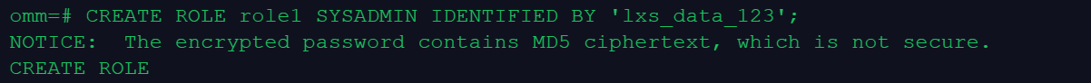 omm=# CREATE ROLE role1 SYSADMIN IDENTIFIED BY 'lxs_data_123';