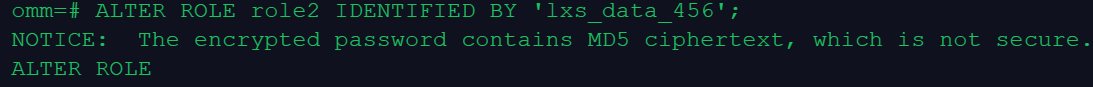 omm=# ALTER ROLE role2 IDENTIFIED BY 'lxs_data_456';