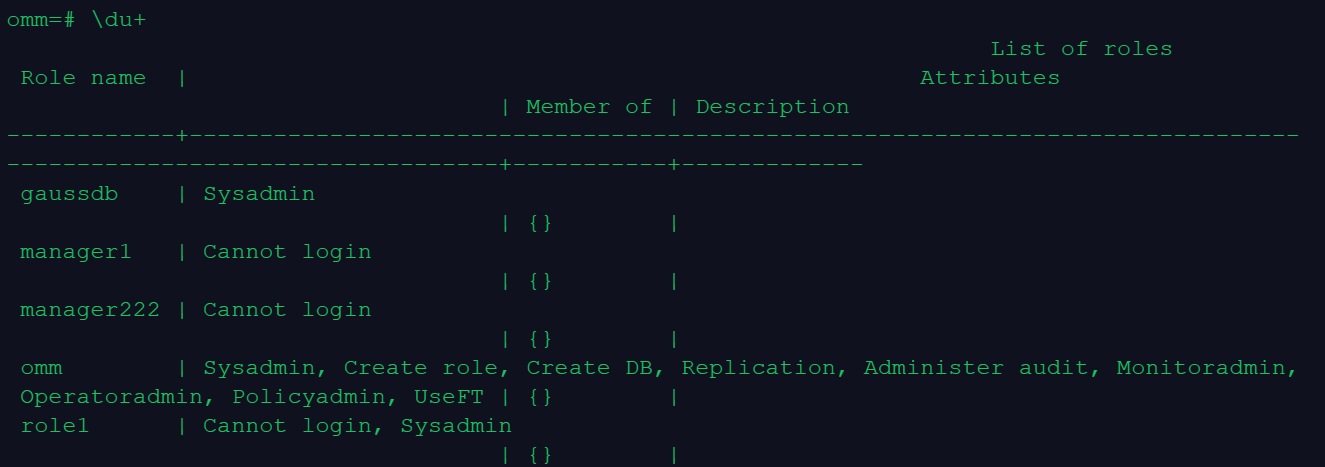 omm | Sysadmin, Create role, Create DB, Replication, Administer audit, Monitoradmin, Operatoradmin, Policyadmin, UseFT | {} | | {} |