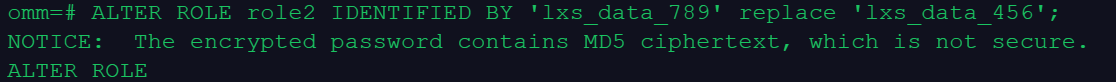 omm=# ALTER ROLE role2 IDENTIFIED BY 'lxs_data_789' replace 'lxs_data_456';