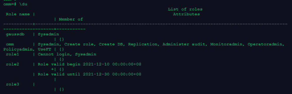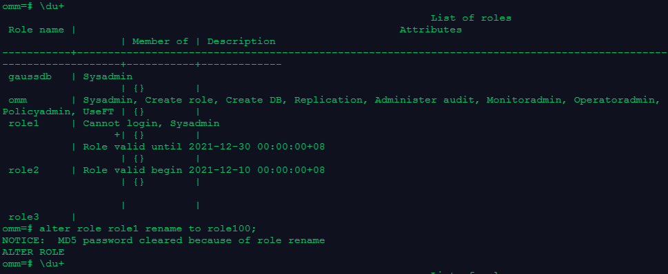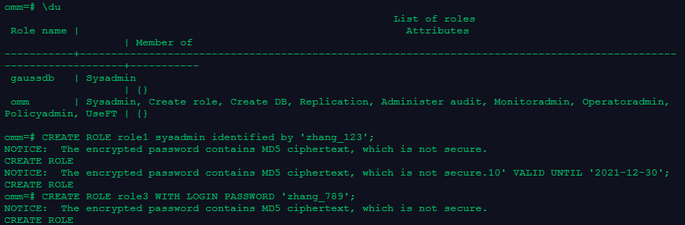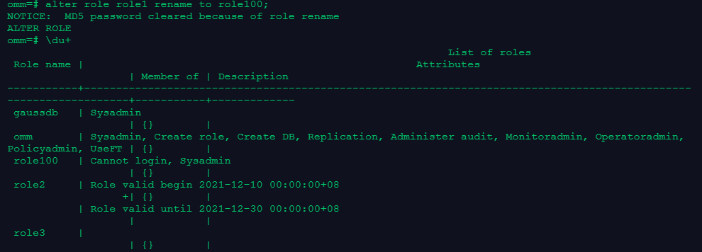 CREATE ROLE role2 WITH LOGIN PASSWORD 'zhang_456' VALID BEGIN '2021-12-10' VALID UNTIL '2021-12-30';