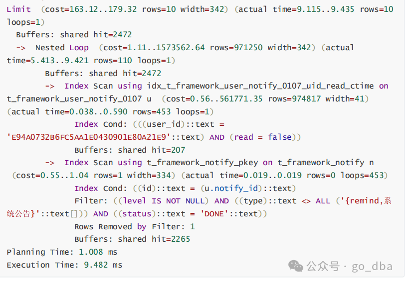 Limit (cost=238.57..262.33 rows=10 width=342) (actual time=217.019..217.697rows=10 loops=1)Buffers: shared hit=46729-> Nested Loop (cost=0.98..2231886.91 rows=939404 width=342) (actualtime=204.298..217.683 rows=110 loops=1)Buffers: shared hit=46729-> Index Scan using index_notify_create_time on t_fXXXXXXk_notify n(cost=0.43..154744.55 rows=1445351 width=342) (actual time=0.024..12.893rows=8300 loops=1)Filter: ((level IS NOT NULL) AND ((type)::text <> ALL ('{remind,系统公告}'::text[])) AND ((status)::text = 'DONE'::text))Rows Removed by Filter: 1261Buffers: shared hit=4136-> Index Scan using index_user_notify_notify_id on t_fXXXXXXk_user_notify u (cost=0.56..1.38 rows=6 width=33) (actual time=0.024..0.024 rows=0 loops=8300)Index Cond: ((notify_id)::text = (n.id)::text)Filter: ((NOT read) AND ((user_id)::text ='E94A0732B6FC5AA1E0430901E80A21E9'::text))