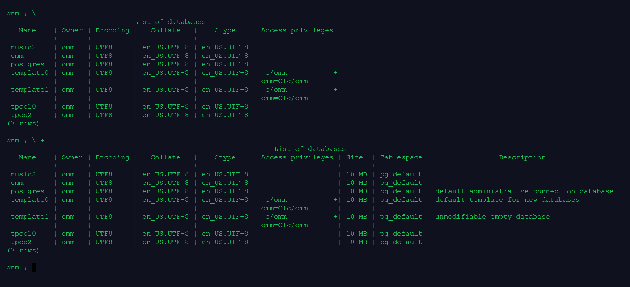 3.分别使用\l和\l+两个元命令查看数据库信息