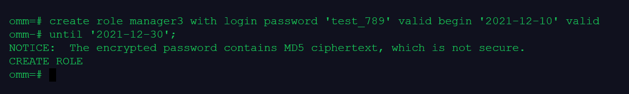 CREATE ROLE manager3 WITH LOGIN PASSWORD 'test_789' VALID BEGIN '2021-12-10' VALID
