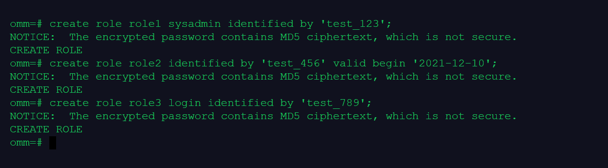 create role role1 sysadmin identified by 'test_123';create role role2 identified by 'test_456' valid begin '2021-12-10';create role role3 login identified by 'test_789';