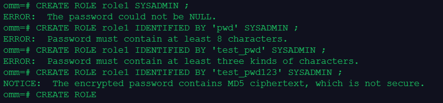 CREATE ROLE role1 IDENTIFIED BY 'test_pwd123' SYSADMIN ;