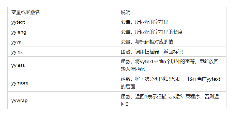 yylex()只需要每次识别出一个token就马上返回这个token的ID即可。上例中返回的token的ID就是TOK_NUMBER。此外,一个token的语义值可以由yylex()计算出来后放在全局变量yylval中。