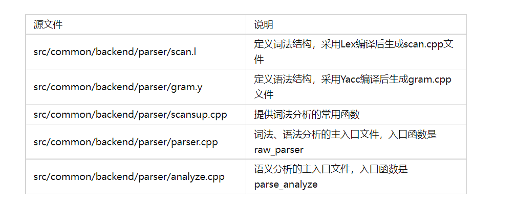 词法结构和语法结构分别由scan.l和gram.y文件定义,并通过flex和bison分别编译成scan.cpp和gram.cpp文件。