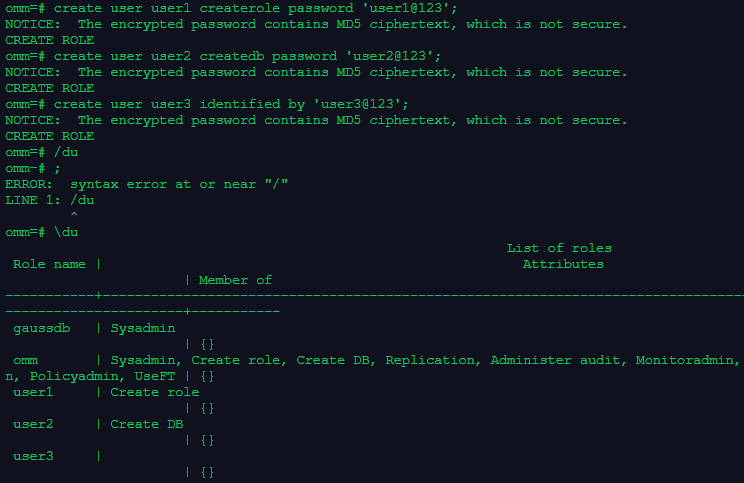 1.创建用户user1、user2和user3,user1具有CREATEROLE权限,user2具有CREATEDB权限,要求使用两种不同的方法设置密码