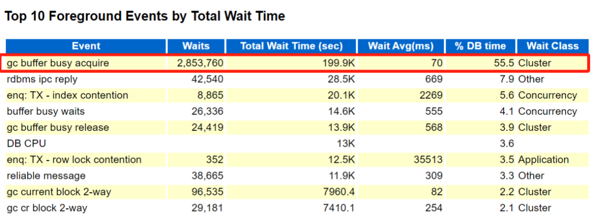 本次故障发生在凌晨,核心应用卡顿非常严重,Oracle数据库直接夯筑了,出现异常等待事件gc buffer busy acquire,以及部分索引和行锁争用。
