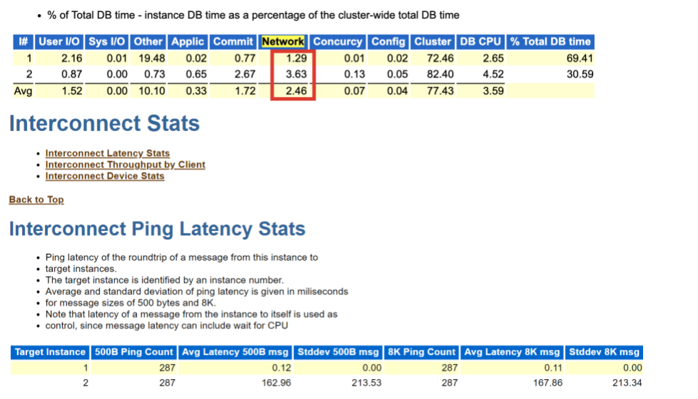 AWR报告进一步分析,发现实例2心跳网络延迟很高