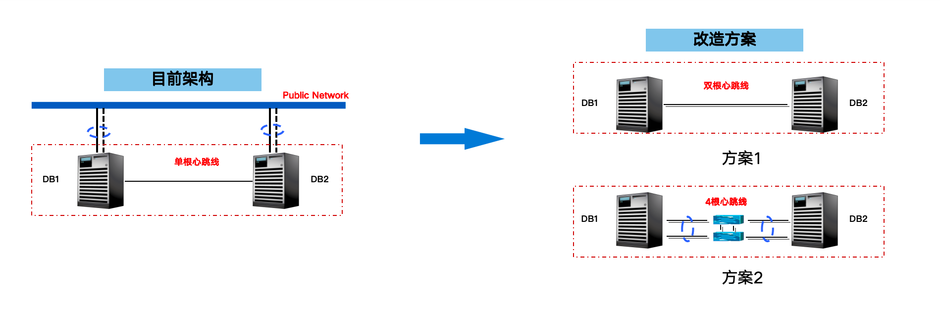 本次心跳线为直连,容易出现接触不良的情况,改造方式为单网线实现网卡网卡聚合、心跳线直连替换位过交换机。