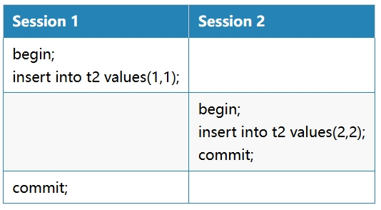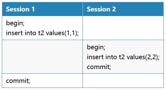 表作为例子来解释。会话一先执行后提交,会话二后执行先提交。