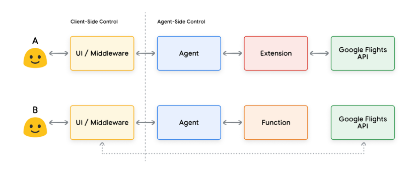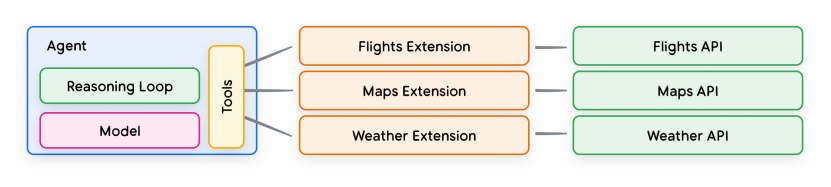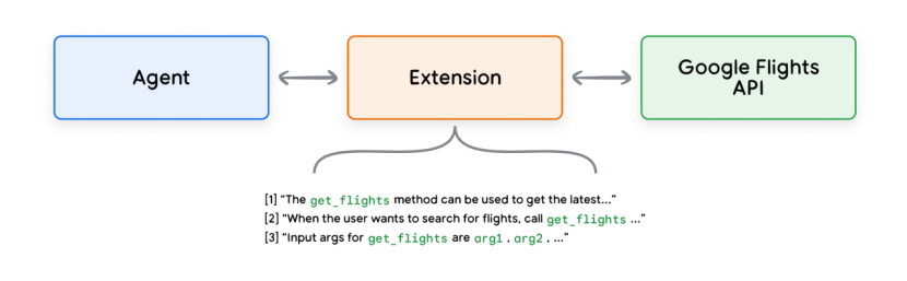 与软件开发人员在解决用户问题时选择使用哪个 API 端点类似,智能体/模型堆栈使用一组已知的扩展来决定哪个最符合用户的查询。例如,如果用户希望预订航班,开发者可能会使用 Google Flights API;如果用户想知道离他们最近的咖啡店在哪里,开发者可能会使用 Google Maps API。同样,智能体可以根据用户查询和任务动态选择适当的扩展。