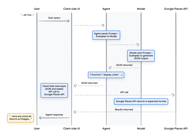 上述 JSON 是由模型生成的,随后被发送到客户端服务器,用以执行开发者希望的操作。例如,我们可以调用 Google Places API,将模型提供的城市信息用于查找图像,然后将其作为格式化的丰富内容返回给用户。
